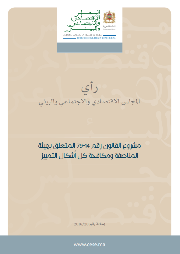 تمت المصادقة على الرأي الذي أبداه المجلـس حـول مشروع القانون رقم 79.14 المتعلق بهيئة المناصفة ومكافحة كل أشكال التمييز، بناء على طلب لإبداء الرأي صادر عن مجلس النواب بتاريخ 17 نونبـر 2016، بإجماع أعضائه خلال الدورة العادية الثامنة والخمسين لجمعيته العامة، المنعقدة يوم 28 يناير 2016، وقـد تطلب إعداد هذا الرأي تنظيـم ثـلاث جلسات إنصات ويومين دراسيين شارك فيهما العديد من الفاعلين المنتمين إلى هيئات حكومية وغيـر حكومية
